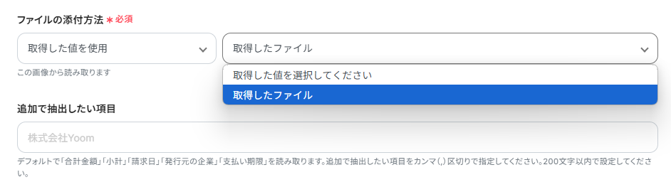 「追加で抽出したい項目」は、デフォルトで取得する値以外の値を取得したい場合に、入力してください。