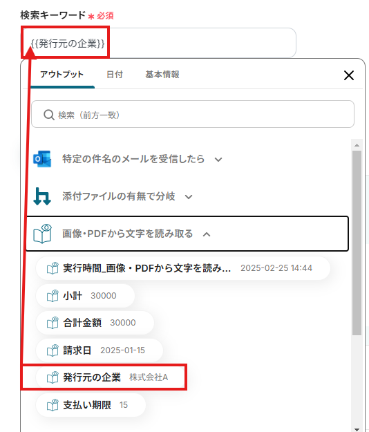 「検索キーワード」は、入力欄をクリックして表示されるアウトプットから選択してください。