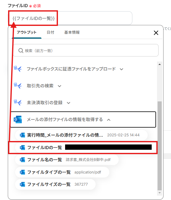 「ファイルID」は、入力欄をクリックして表示されるアウトプットから選択してください。