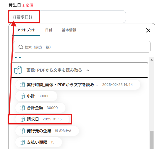 「発生日」「支払い期日」「取引先ID」「取引金額」は、入力欄をクリックして表示されるアウトプットから選択してください。