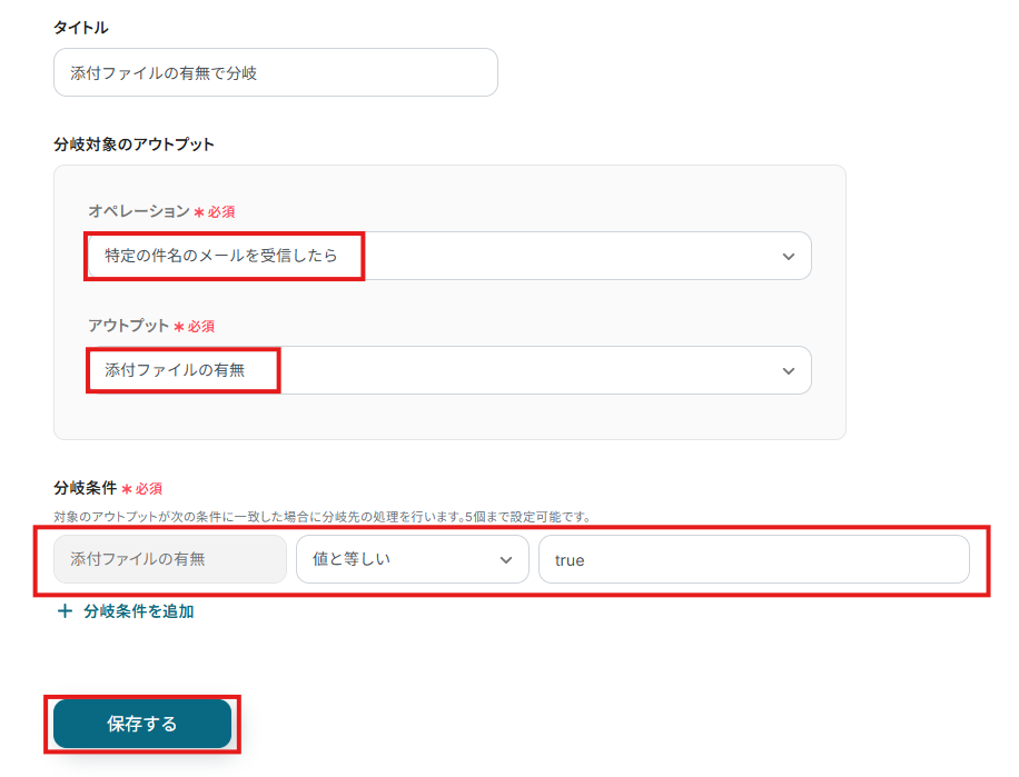 「分岐条件」は、分岐先の処理を行うためのアウトプットの条件を設定します。