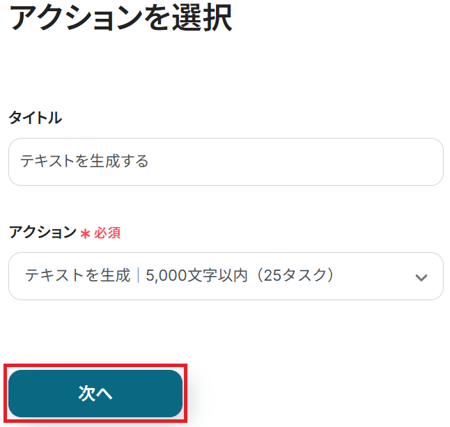 ステップ3と同様、アクションは「テキストを生成|5,000文字以内(25タスク)」のまま「次へ」をクリックしましょう。