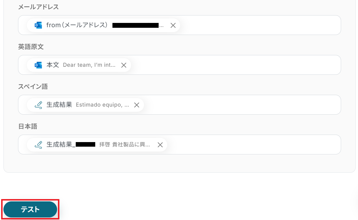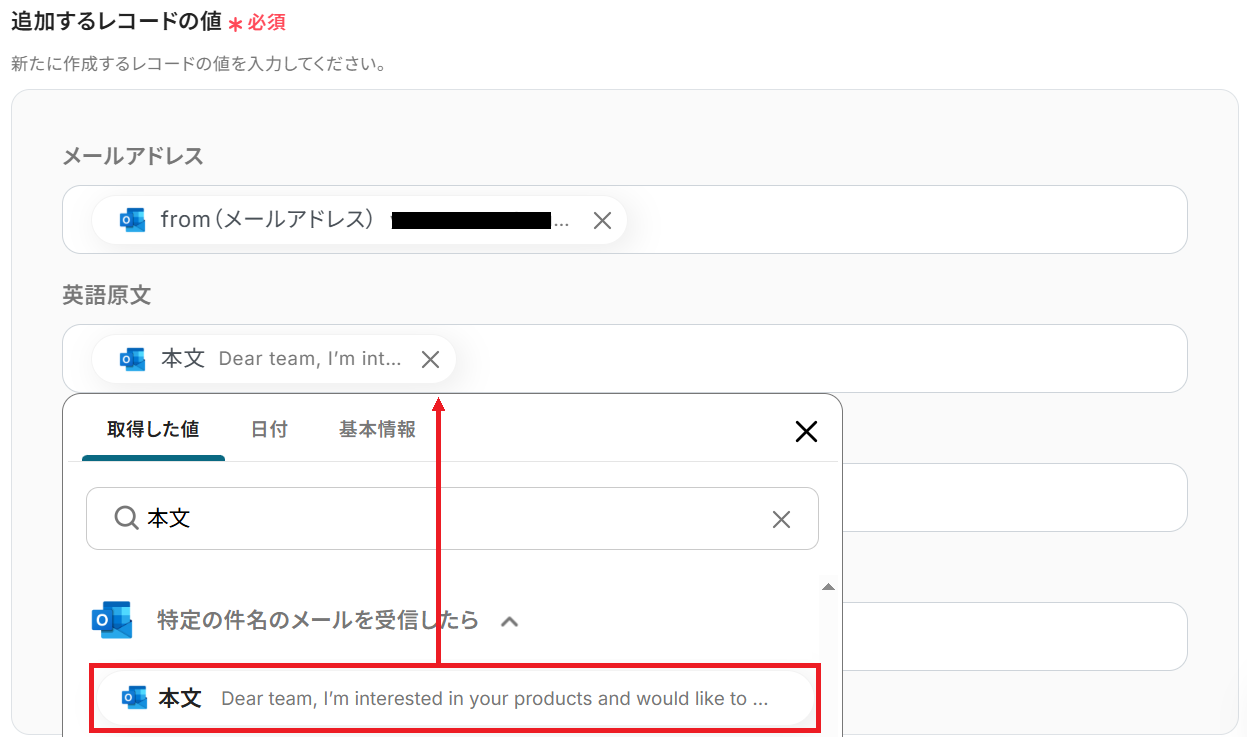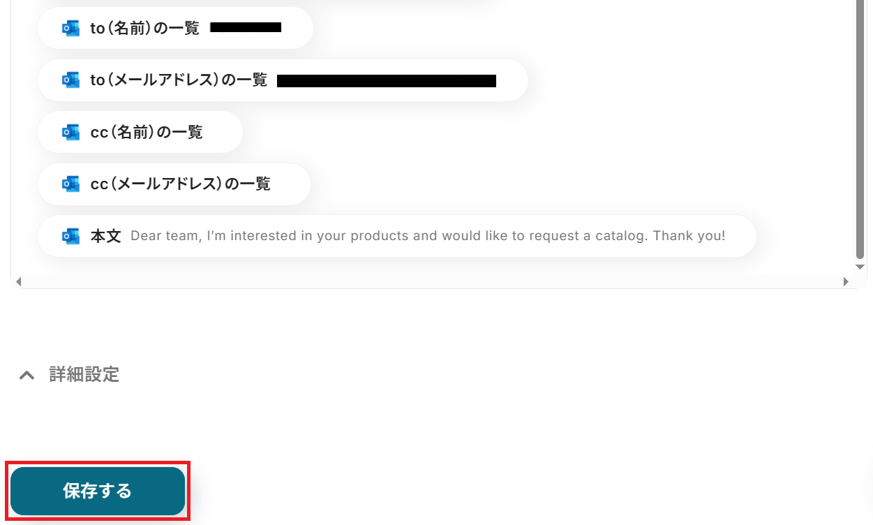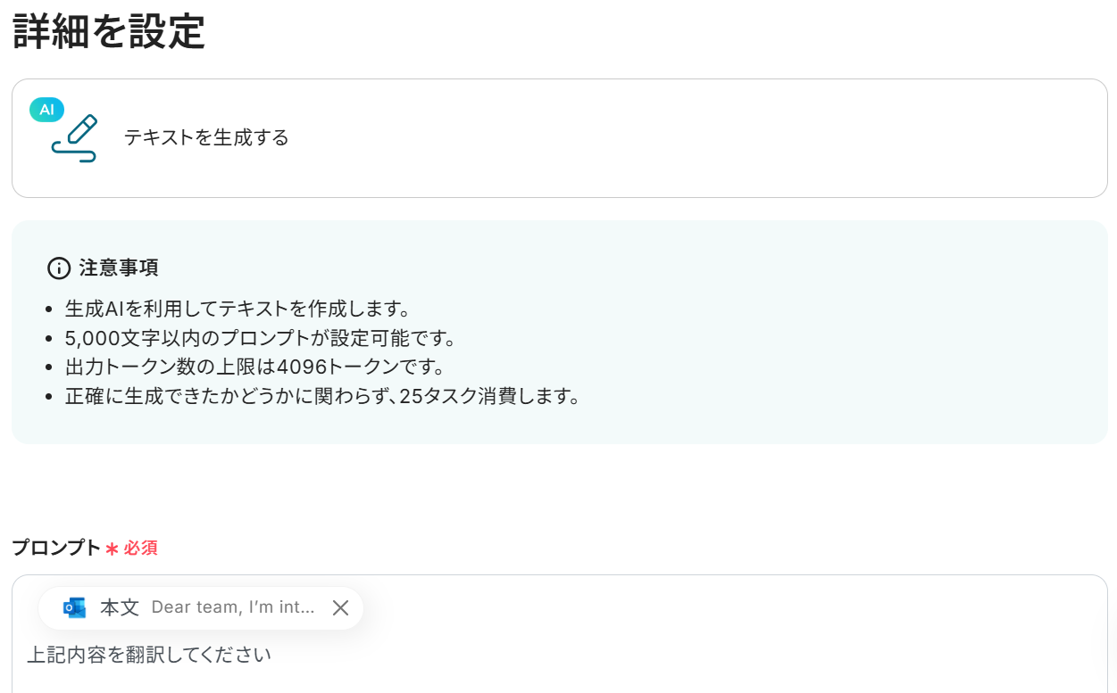以下のようにアウトプットを選択すると、ステップ3で取得したOutlookの情報やステップ4・5で生成した翻訳内容を変数として反映させることができます。