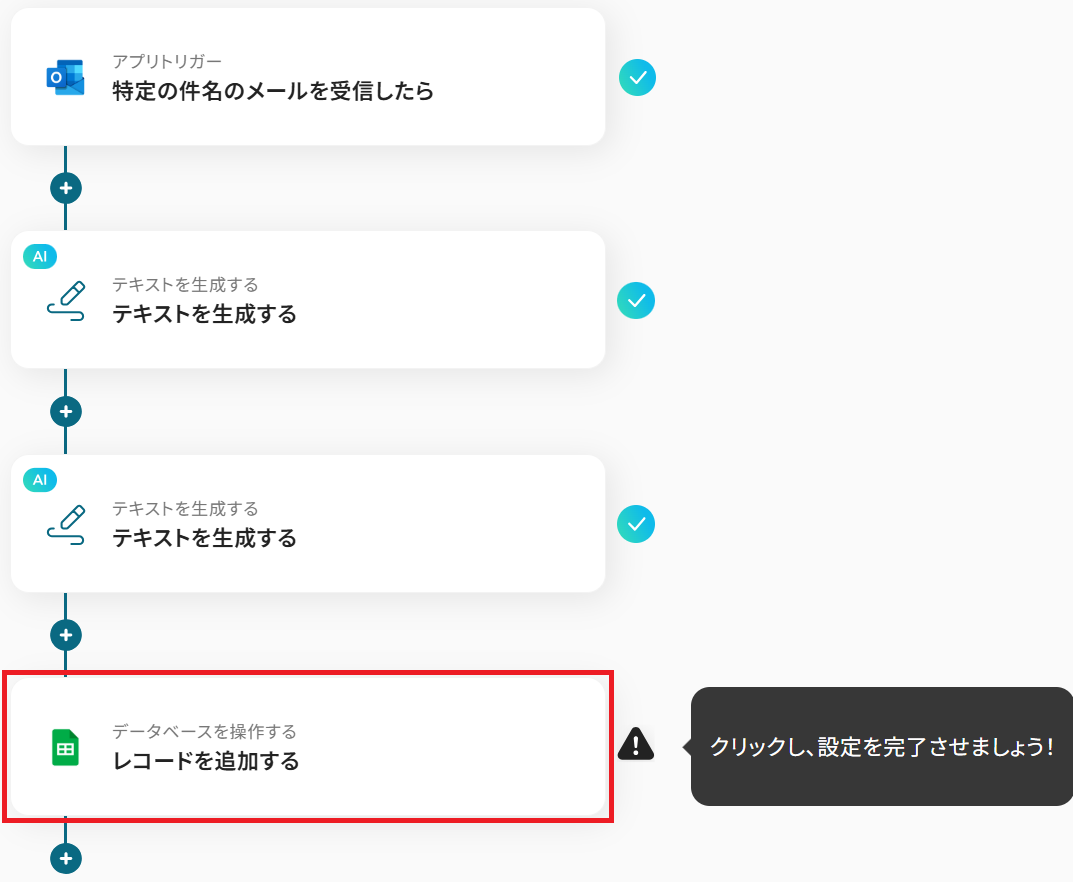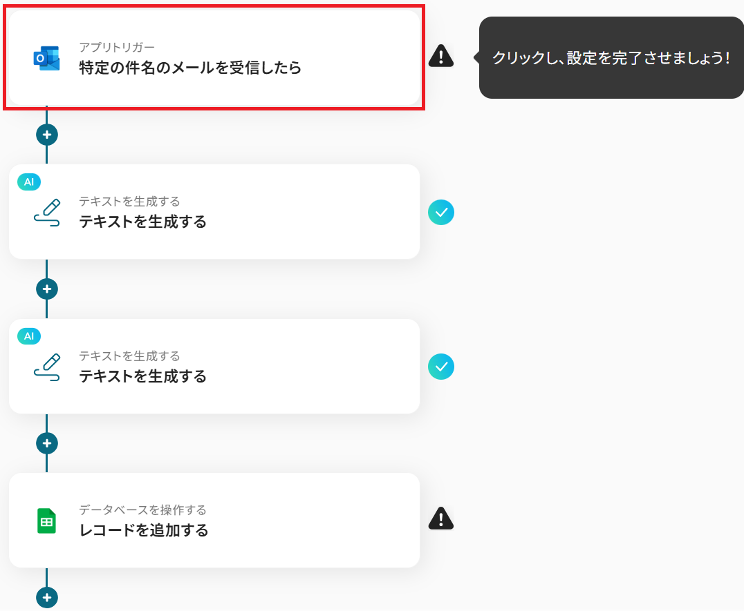 Outlookで受信した情報をAIで抽出し、Google スプレッドシートに追加するフローです。