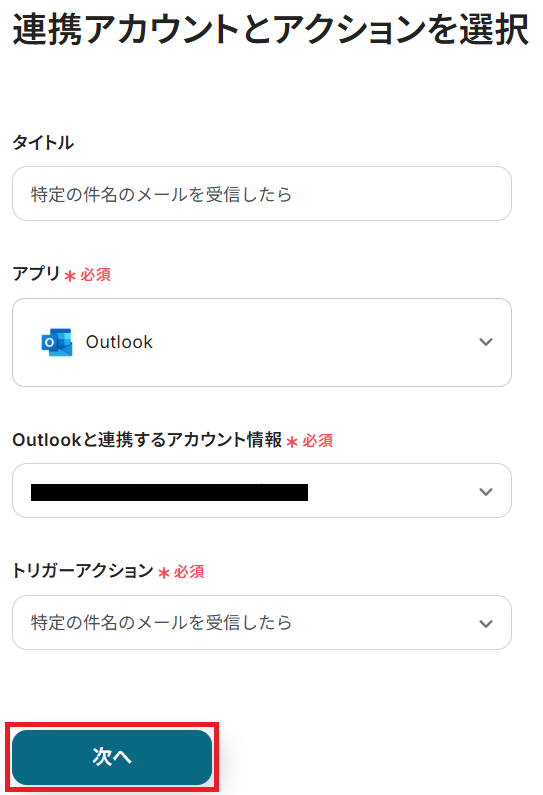 タイトルと連携するアカウント情報を任意で設定し、トリガーアクションはテンプレート通りに「特定の件名のメールを受信したら」のまま「次へ」をクリックしてください。