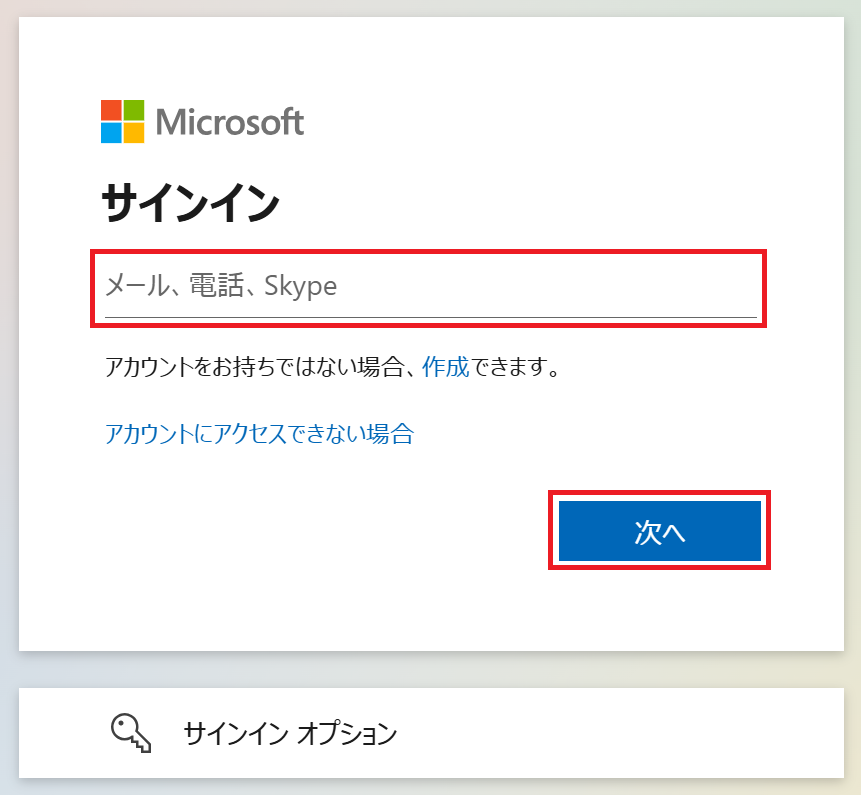 メールアドレスまたは電話番号を入力し「次へ」をクリックします。