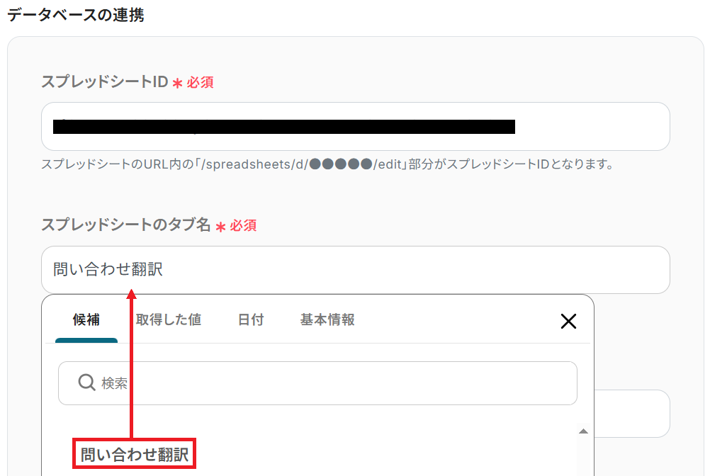 次に、先ほど用意したシートの「スプレッドシートID」と「スプレッドシートのタブ名」を候補から選択してください。