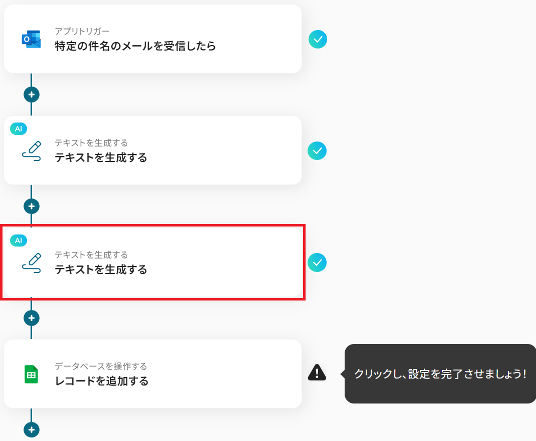 このワークフローは、Outlookで特定の件名のメールを受信すると、AIが内容を解析し、自動でGoogle スプレッドシートに情報を追加します。