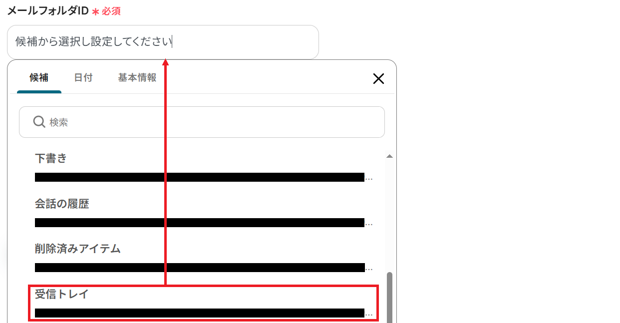 次にメールフォルダIDを候補から選択してください。