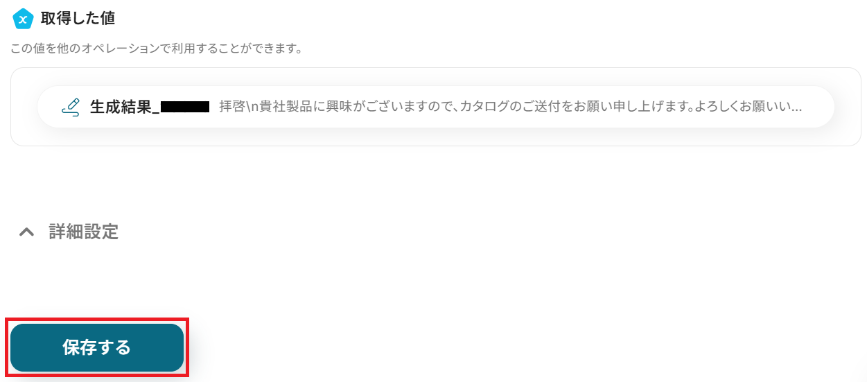 成功したら保存してください。ここで取得したアウトプットの値は次のステップで活用します。