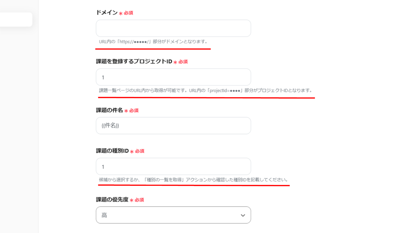 (3)「API接続設定」画面から、赤線を確認の上、ドメイン、課題を登録するプロジェクトID、課題の識別IDを入力します。