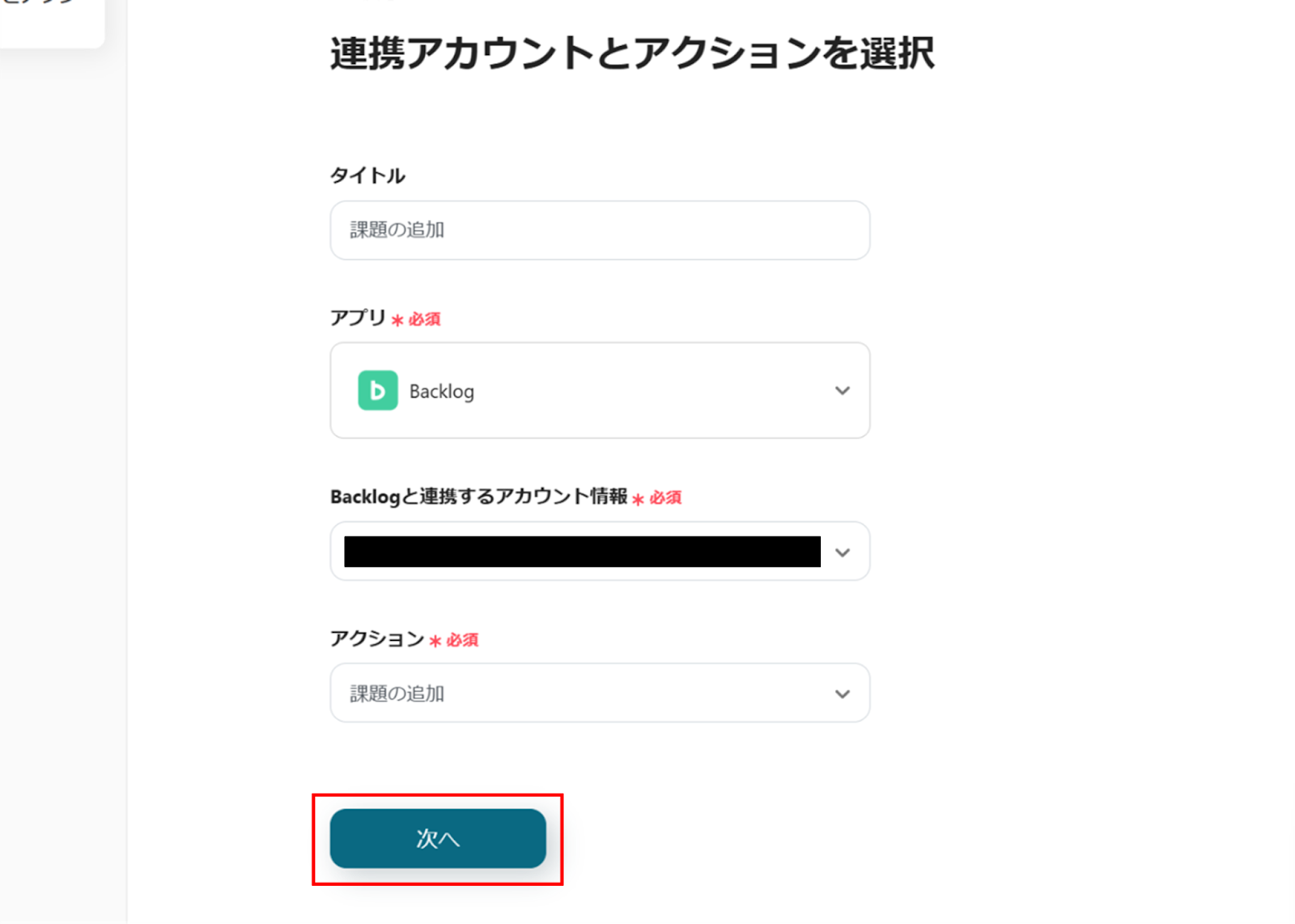 (2)Backlogの「連携アカウントとアクションを選択」画面から、Backlogと連携するアカウント情報に誤りがないかを確認し、アクションは「課題の追加」のままで「次へ」をクリックします。