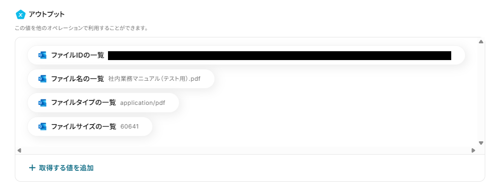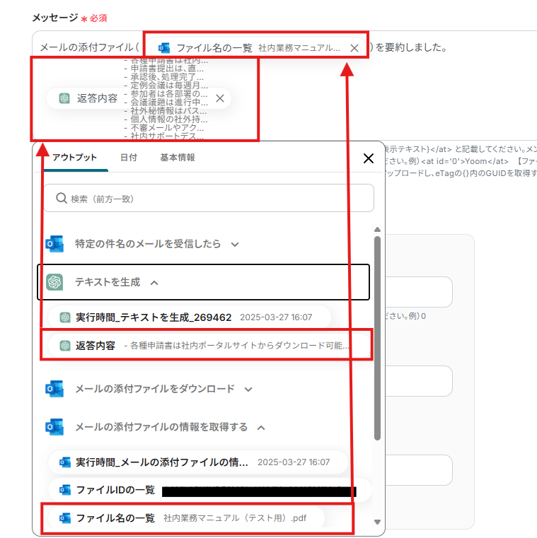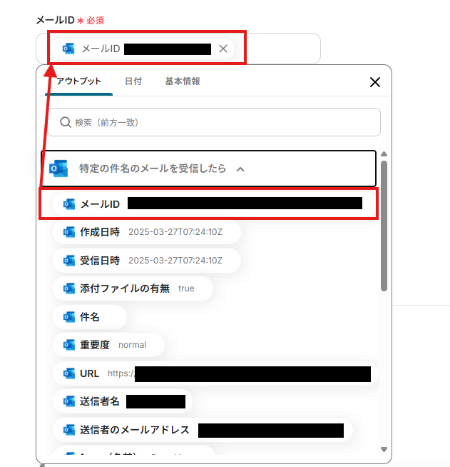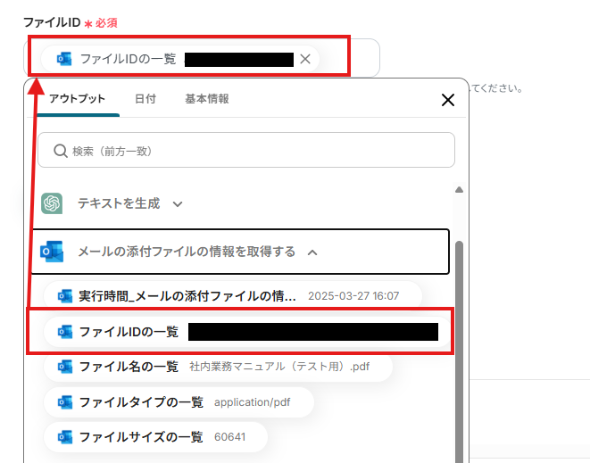 「メールID」「ファイルID」は、入力欄をクリックして表示されるアウトプットから選択してください。