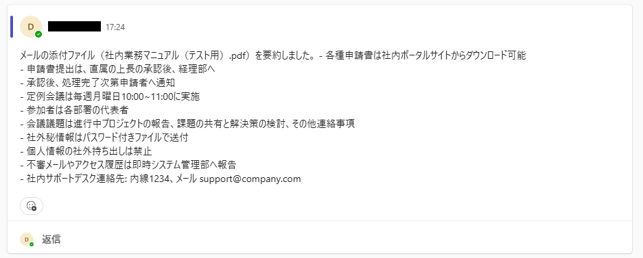 ※設定が完了すると、以下画像のようにMicrosoft Teamsで要約されたファイルの文章が通知されます。