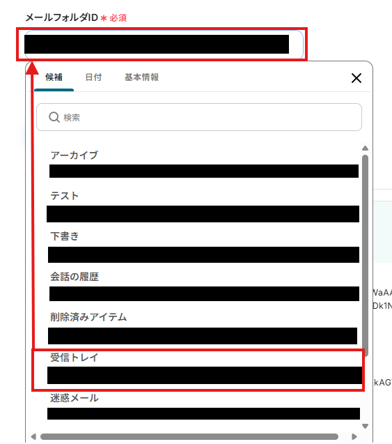 4.「メールフォルダID」は、入力欄をクリックして表示される候補から選択してください。