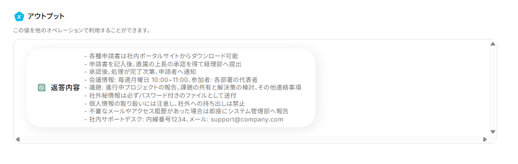 このワークフローを活用することで、OutlookとChatGPTの連携により自動で返信文を生成し送信までをスムーズに行うことができます。