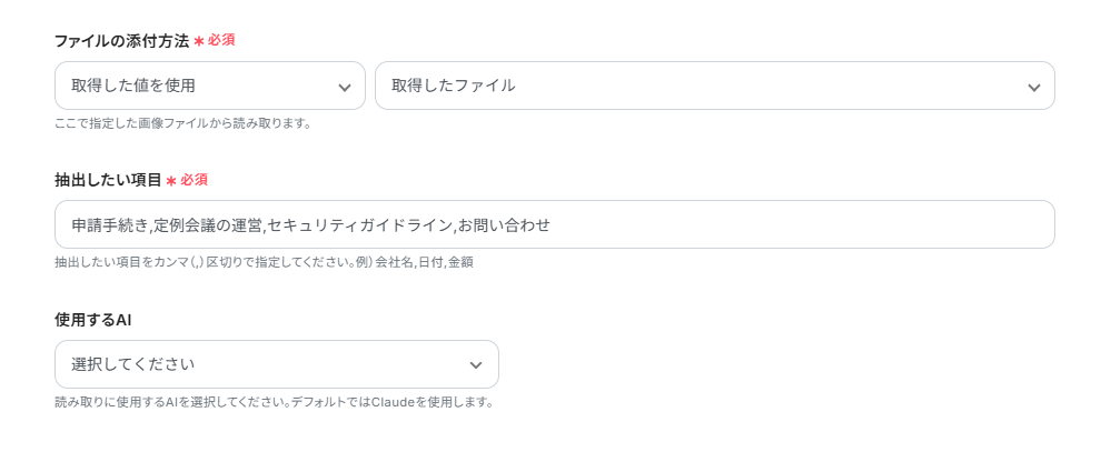 「ファイルの添付方法」「抽出したい項目」は、テンプレートを活用して、以下画像のように設定しました。