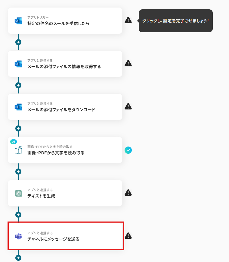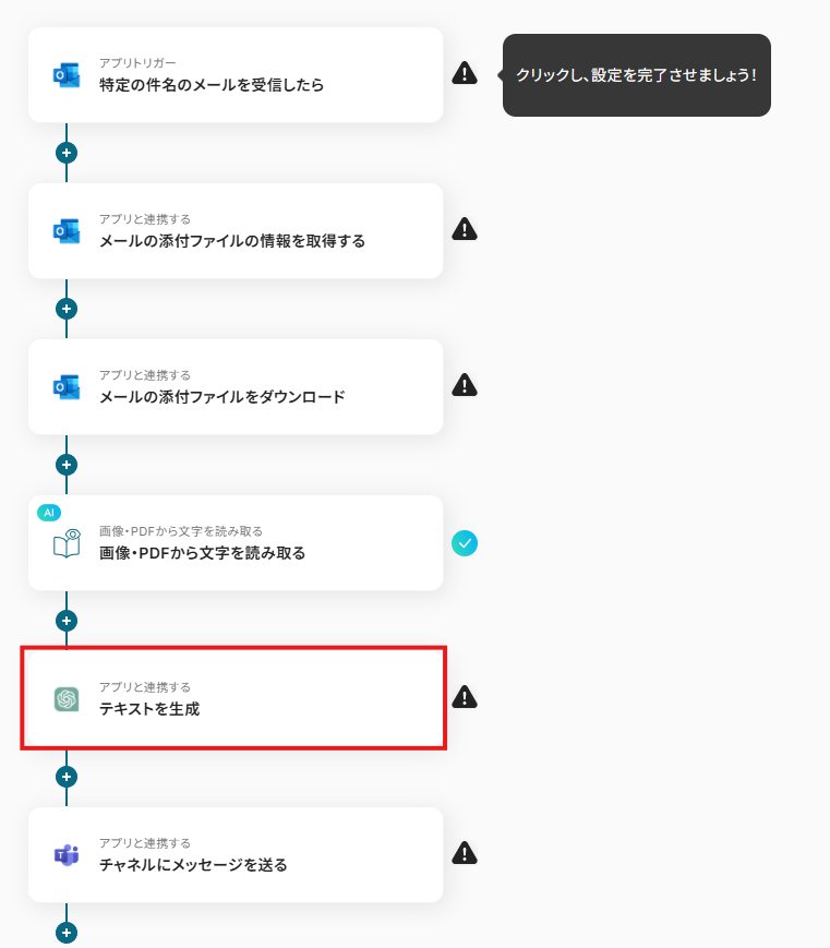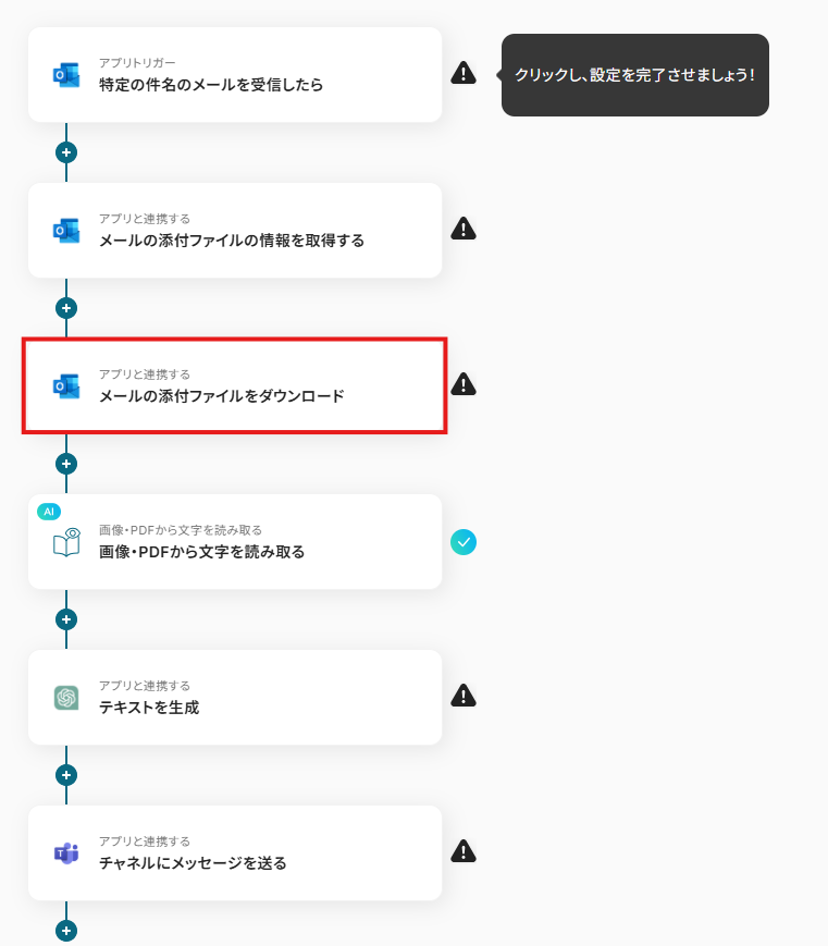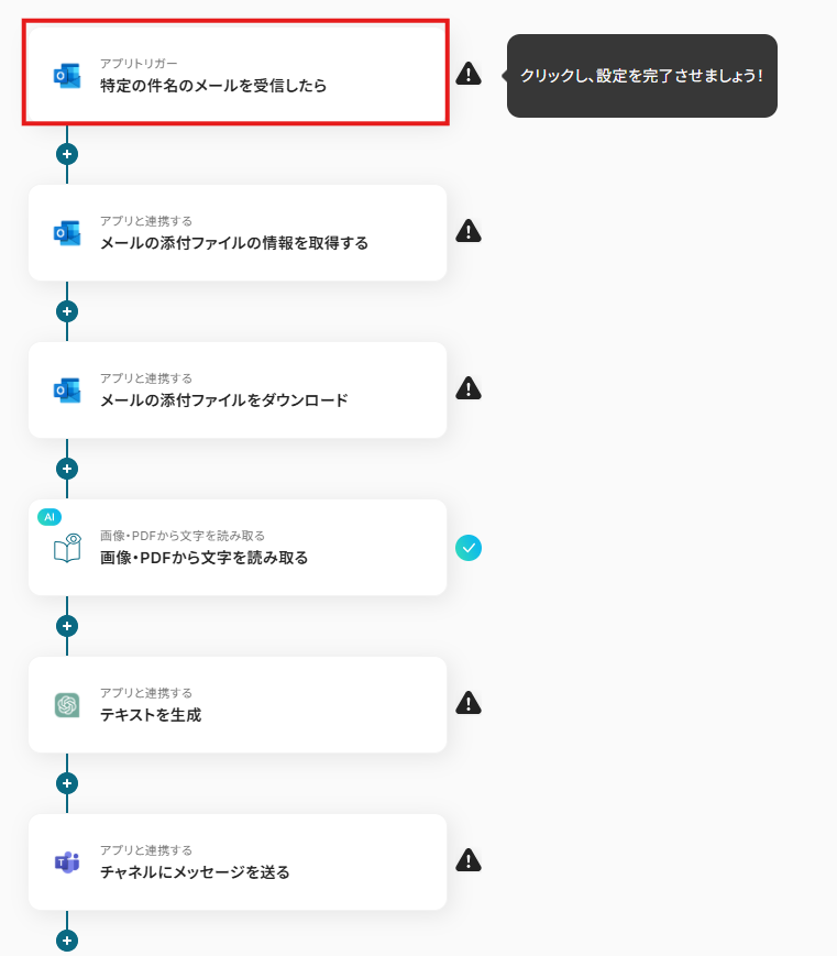 ※以下の画面は、Yoomページ画面左側「マイプロジェクト」のフローボットで表示される、「【コピー】Outlookの添付ファイルのテキストを抽出し、ChatGPTで要約して通知する」をクリックすると表示されます。