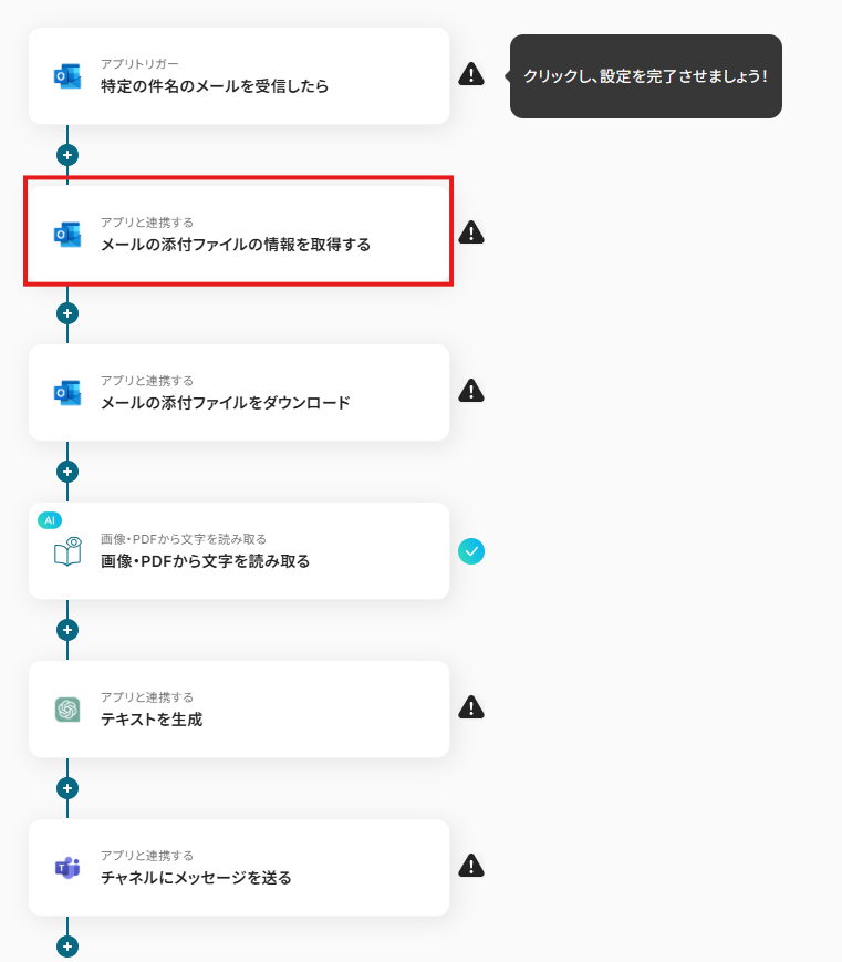 1.アプリと連携する「メールの添付ファイルの情報を取得する」をクリックしてください。