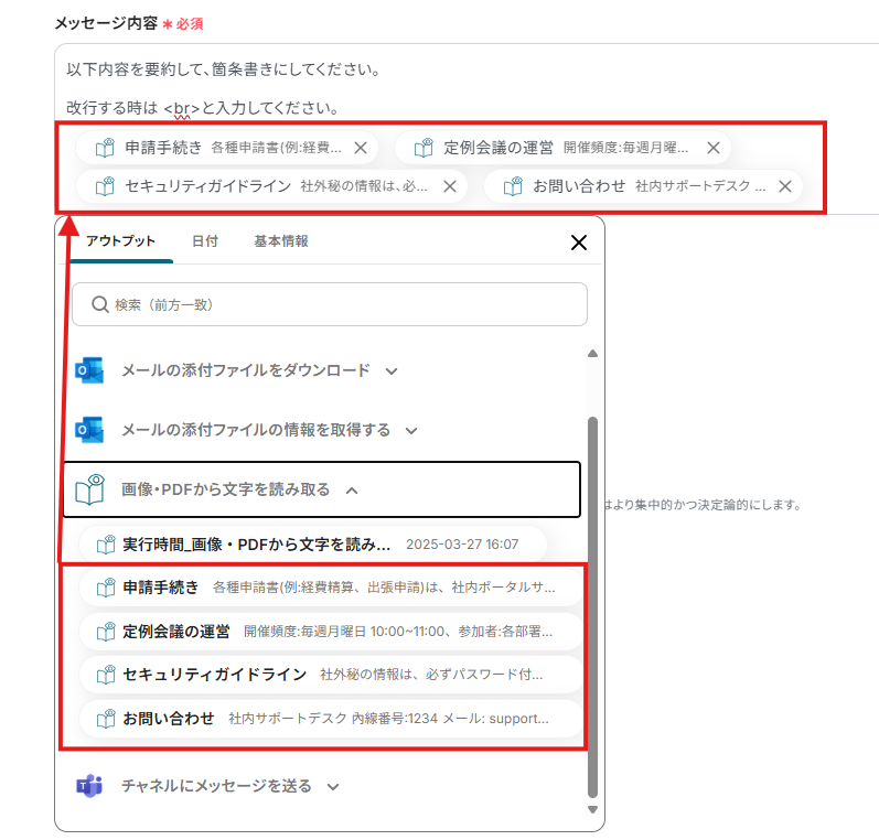 「メッセージ内容」は、入力欄をクリックして表示されるアウトプットから選択してください。
