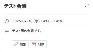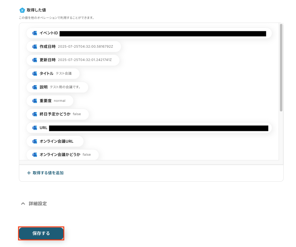テストに成功すると、Outlookに登録されたイベントの情報が一覧で表示されます。