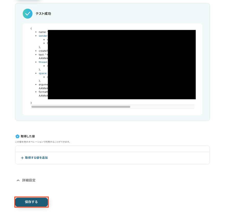 テストに成功すると、Google Chatに通知されたメッセージの情報が表示されます。