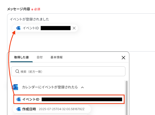 入力欄をクリックすると、前のステップでOutlookから取得済みのアウトプットが表示されるので、任意のテキストと組み合わせて自由に内容をカスタマイズすることも可能です。