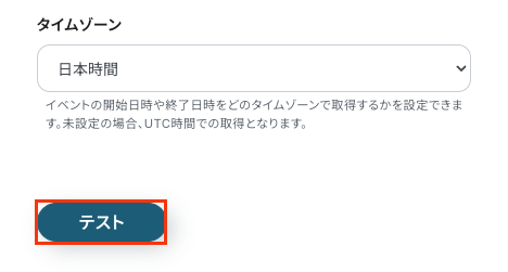 入力が完了したら「テスト」をクリックして、テスト用にカレンダーへ登録したイベント情報が取得されるか確認しましょう。