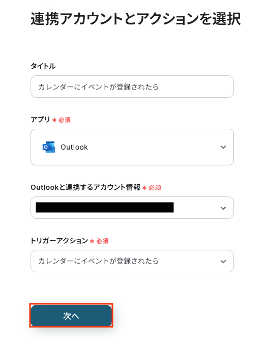 Outlookと連携するアカウント情報に問題がなければ、「次へ」をクリックします。