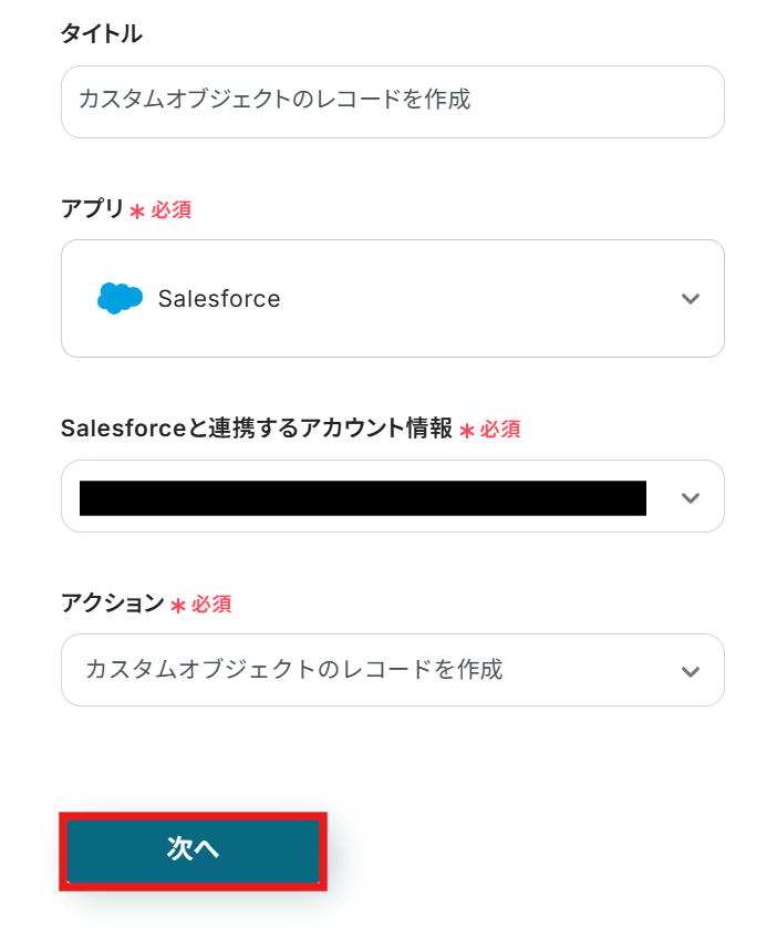 アクションに「カスタムオブジェクトのレコードを作成」を選んだら、「次へ」をクリックします。