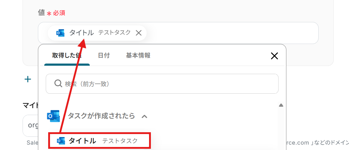 値:入力欄をクリックすると、Outlookから取得した値を引用できます。