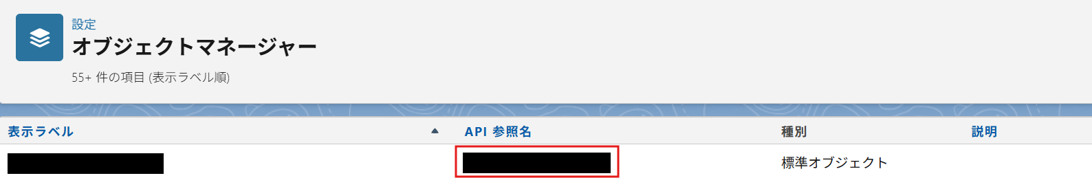 カスタムオブジェクトのAPI参照名:オブジェクトマネージャーから確認できます。