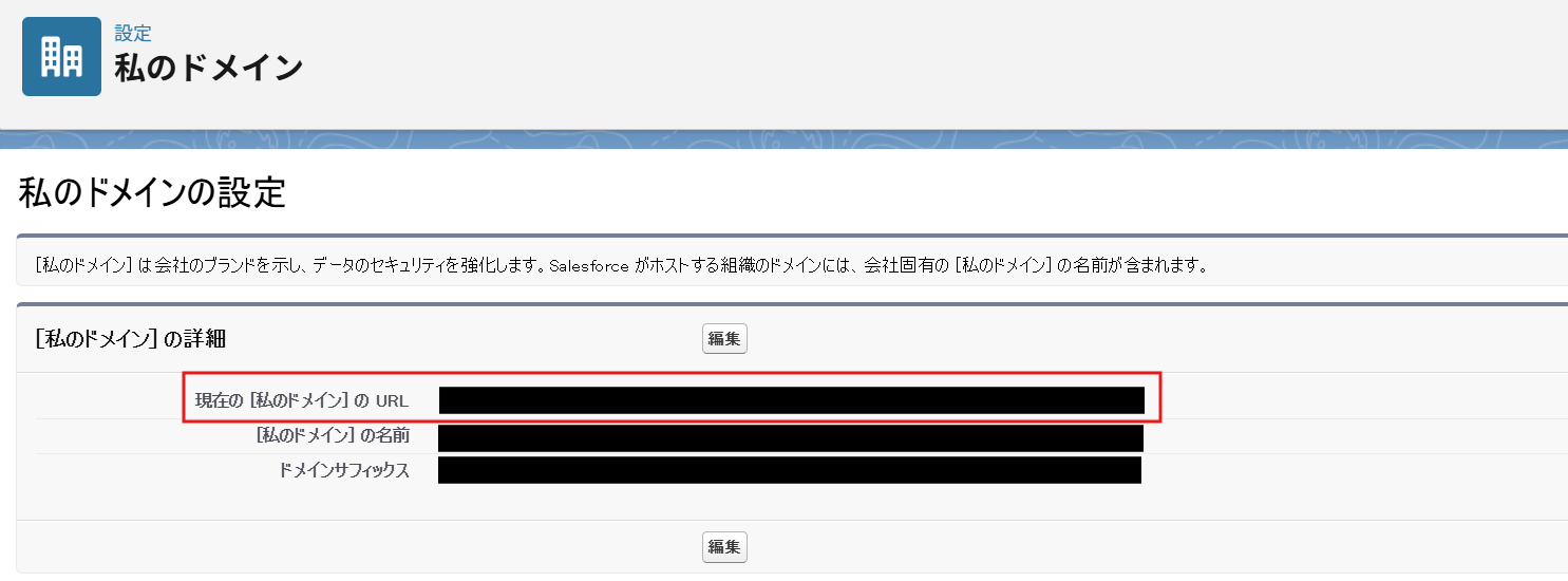 マイドメインURL:Salesforceの「設定」から「私のドメイン」へ進み、表示されている [私のドメイン] の URL に記載されているドメイン(例:yoom.my.salesforce.com)を確認してください。