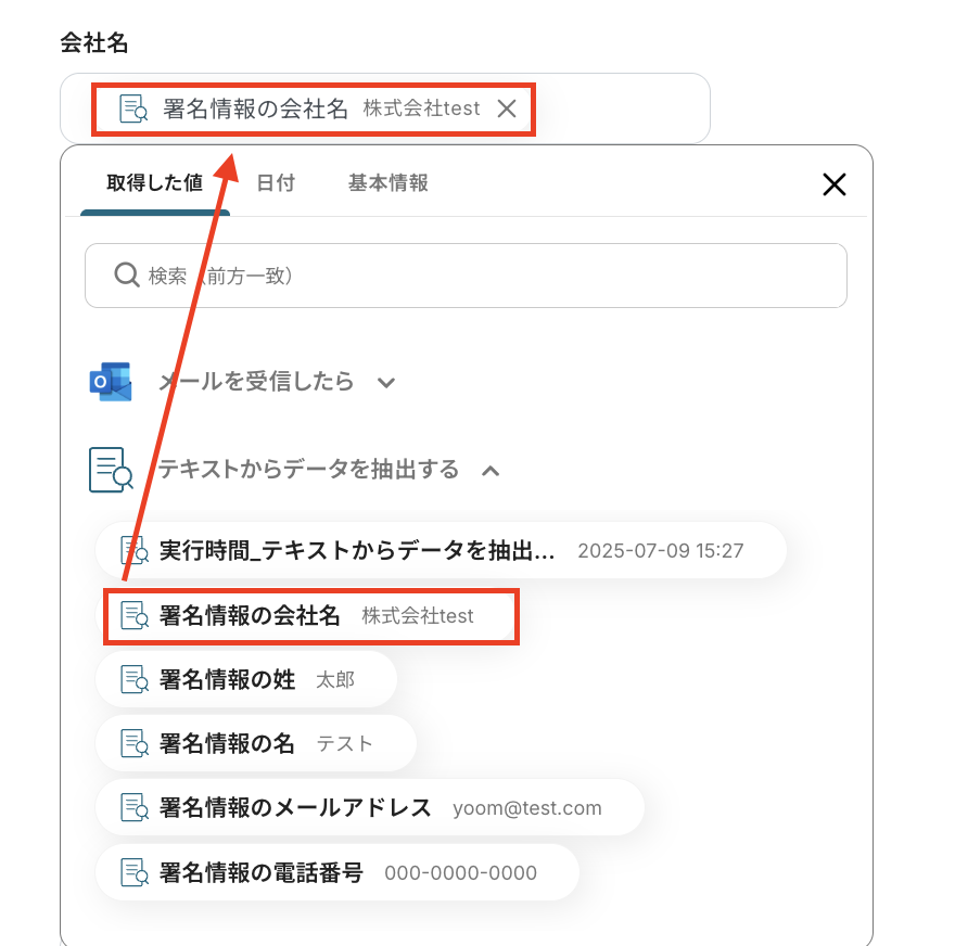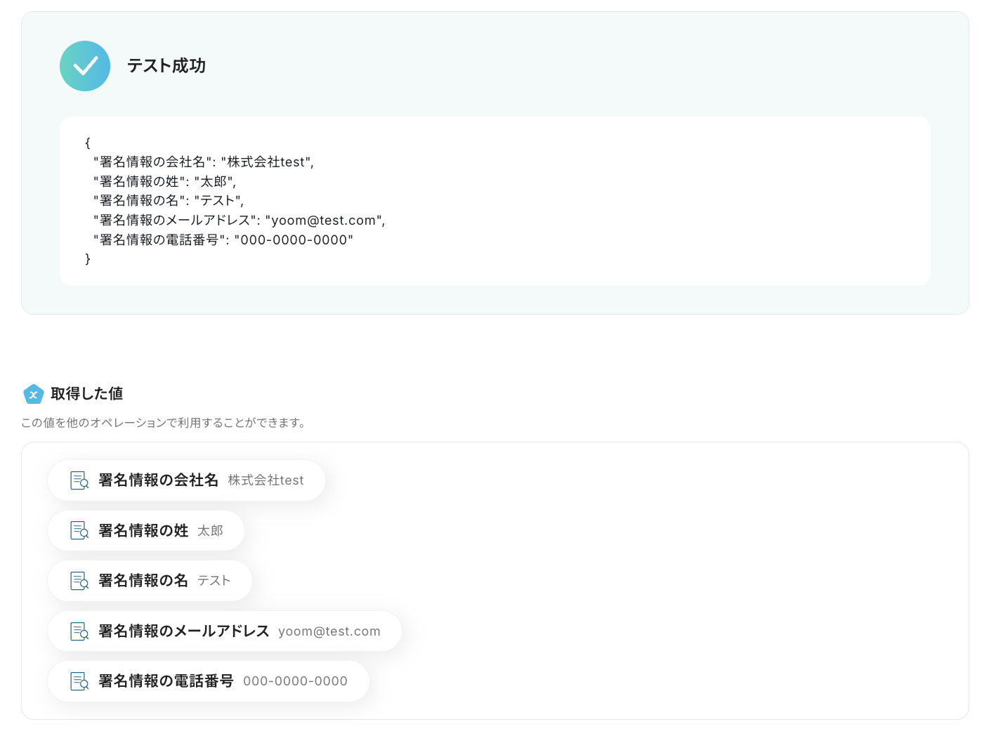 たとえば、「会社名」には「取得した値」の「テキストからデータを抽出する」内にある「署名情報の会社名」を設定する、といった形でそれぞれに適切なアウトプットを設定してみてくださいね!