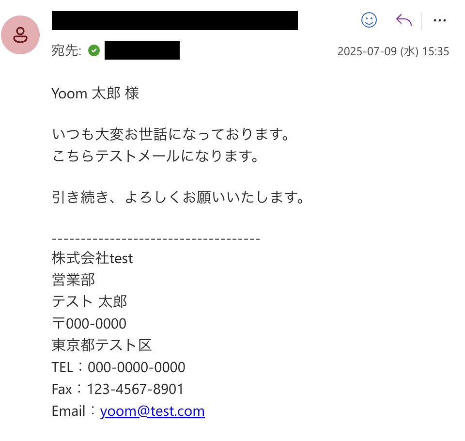 今回は、Outlookに届いたメールの署名情報を使って、HubSpotにコンタクトを作成するので、テスト送信するメールには署名情報を記載してくださいね!