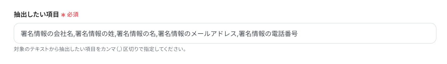 抽出したい項目:メールの本文から抽出したいテキストデータの項目を設定します。「署名情報の会社名」や「署名情報の姓」など、抽出したい項目をカンマ(,)区切りで入力してくださいね!