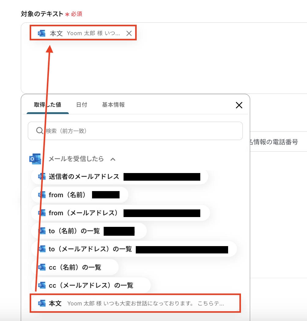 対象のテキスト:テキストデータを抽出する対象となる値をアウトプットを使って設定します。ここではOutlookで受信したメールの本文が対象となるので、下図のように設定してください。