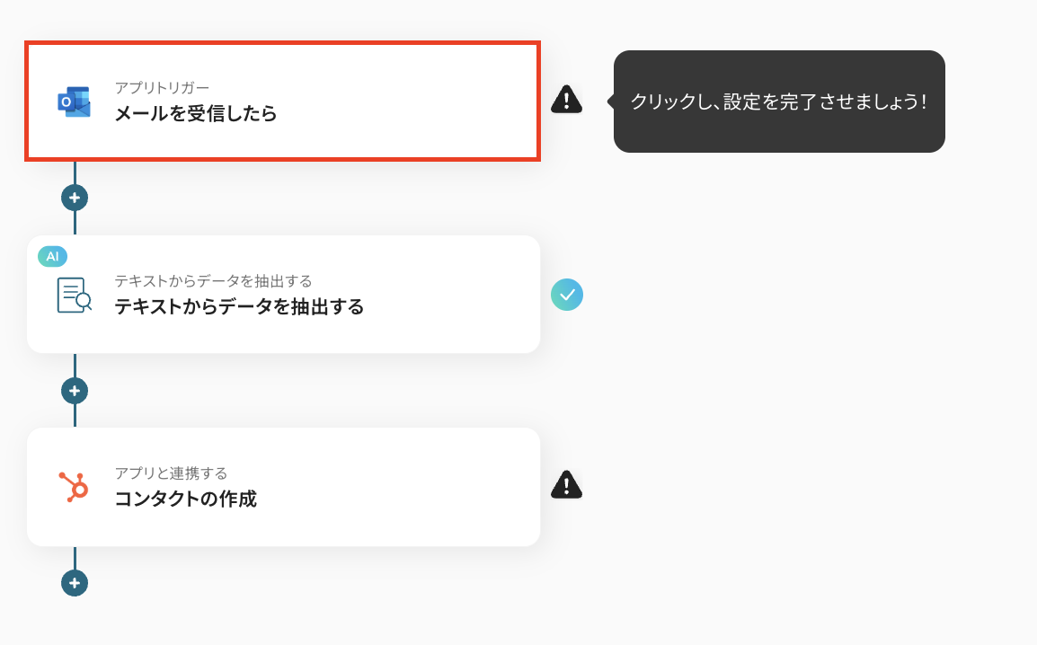 このテンプレートは、Outlookで受信したメールの署名情報をAIが自動で解析し、会社名や氏名、役職、メールアドレスなどを抽出してHubSpotに新しいコンタクトとして登録します。