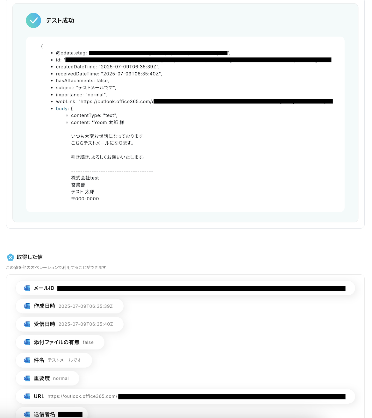 テストが成功すると、先ほどしたメールの内容が「取得した値」にアウトプットとして抽出されるので、内容を確認しましょう。