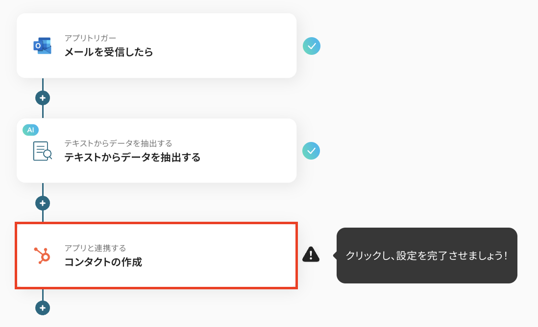 最後に、ステップ4で抽出したデータを使って、HubSpotにコンタクトを作成する設定です。