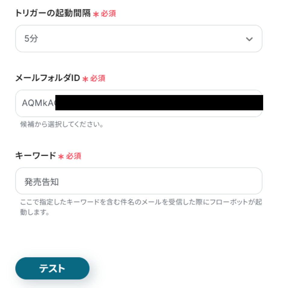 メールフォルダIDのフィールドをクリックし、候補から連携したいフォルダを選択します。