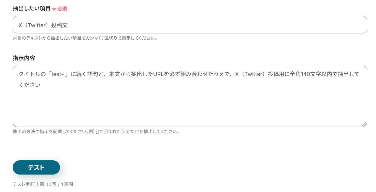 次に抽出したい項目と指示内容を入力します。 指示内容は、AIが判断しやすいように、わかりやすく指示しましょう!