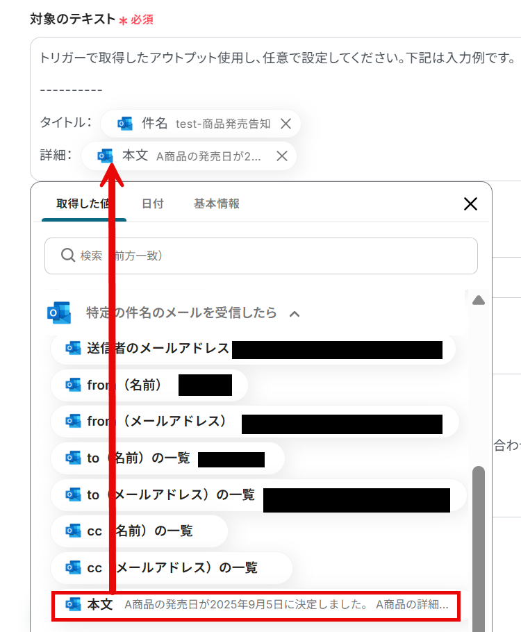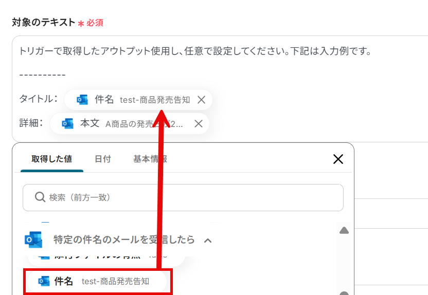 以下の画像のように取得した値を活用することで、フローが起動する度に最新のデータからテキスト抽出が可能となります。 なお、テキストを直接入力した部分は固定値とされるため、下記画像のように「タイトル」などは手入力し、毎回変動することが望ましい「件名」などは取得した値を活用しましょう。