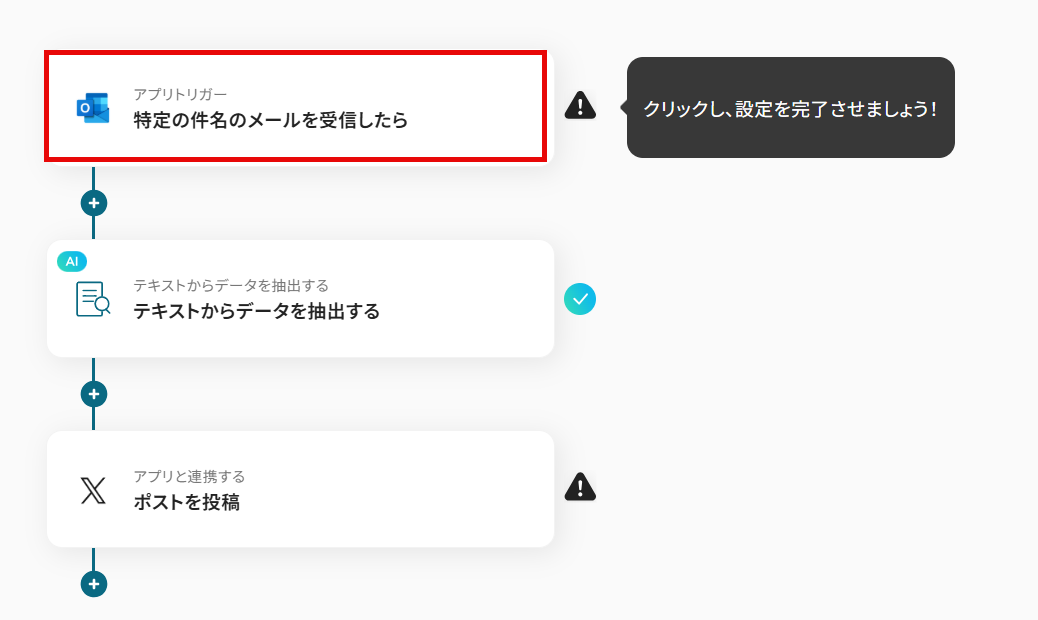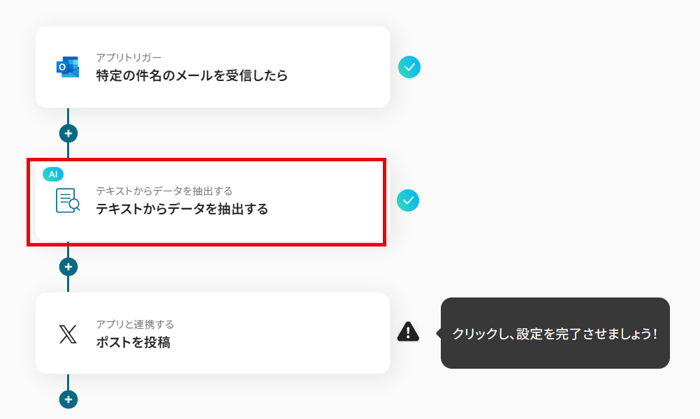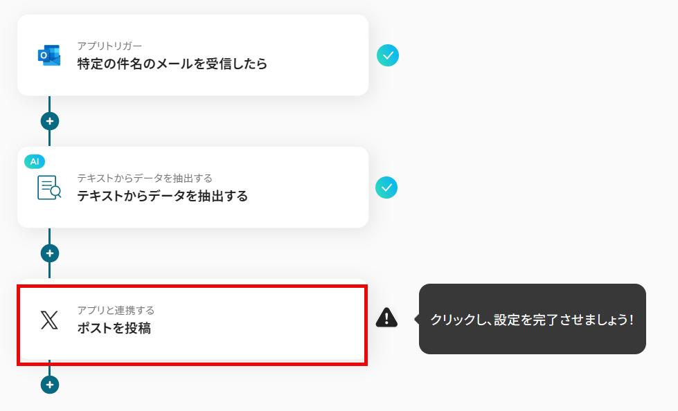 Outlookのトリガー設定では、特定のメールフォルダを指定したり、件名に含まれるキーワードを任意で設定したりすることが可能です AI機能によるテキスト抽出では、メール本文から投稿に必要なタイトルやURLなど、抽出したい項目を自由に指定できます X(Twitter)への投稿内容は、固定のテキストやハッシュタグを追加したり、前段のオペレーションで抽出した情報を組み込んだりして柔軟に作成できます ■注意事項