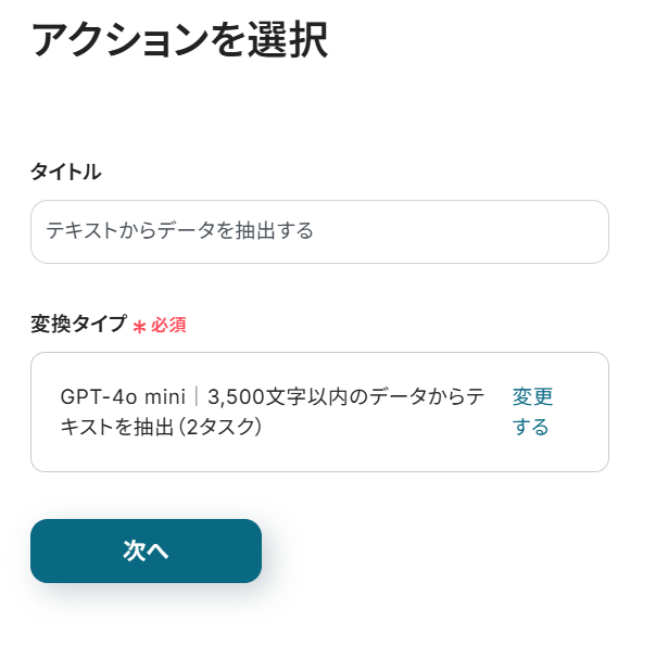 次に2つ目の工程をクリックします。 前項で取得した値から、テキストを抽出する設定を行います。