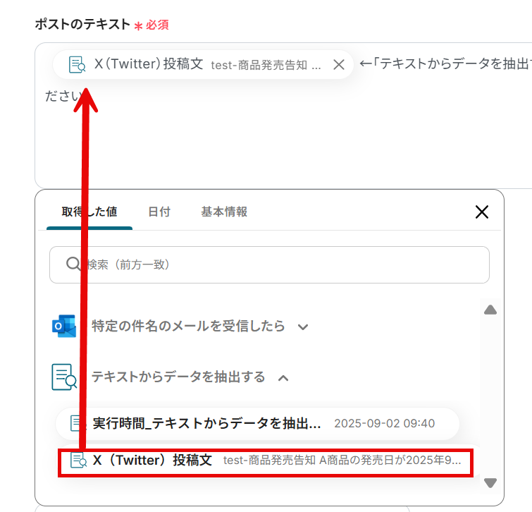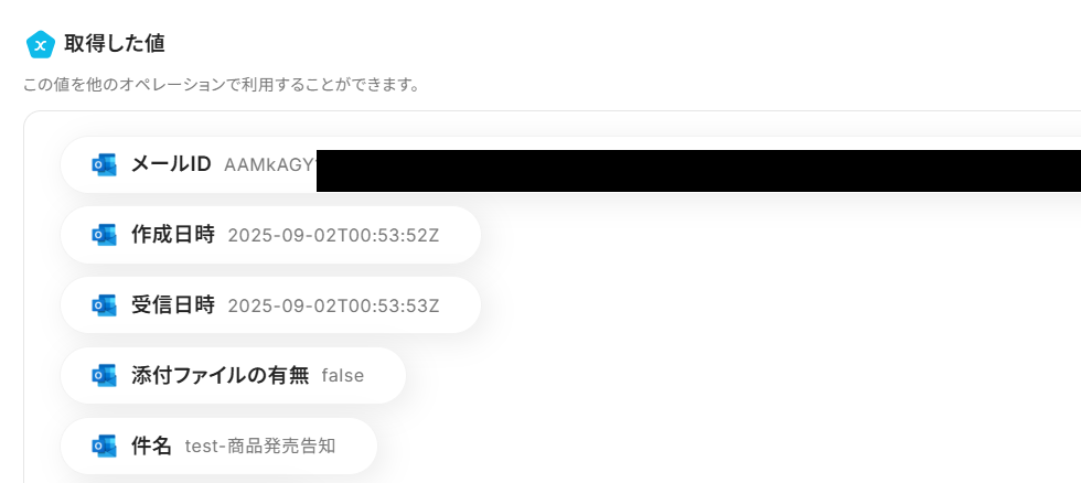 テストが成功すると、取得した値が表示され、Outlookのデータが確認できます。「保存する」をクリックして完了です! 取得した値について、こちらの記事 も参考にしてください。なお、この取得した値はこの後の設定で活用でき、X(Twitter)に自動投稿可能です!