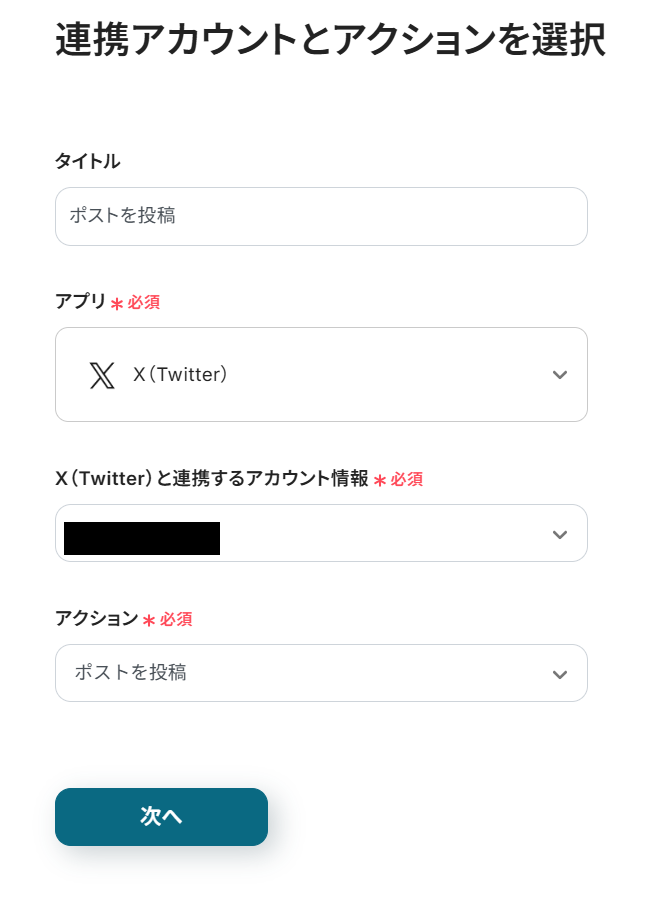 X(Twitter)の「ポストを投稿」アクションでは、投稿するテキストを自由にカスタマイズできます。「新しい動画を公開しました!」などの固定テキストと、トリガーで取得したYouTube動画のタイトルやURLといった動的な値を組み合わせて設定してください。 ■注意事項