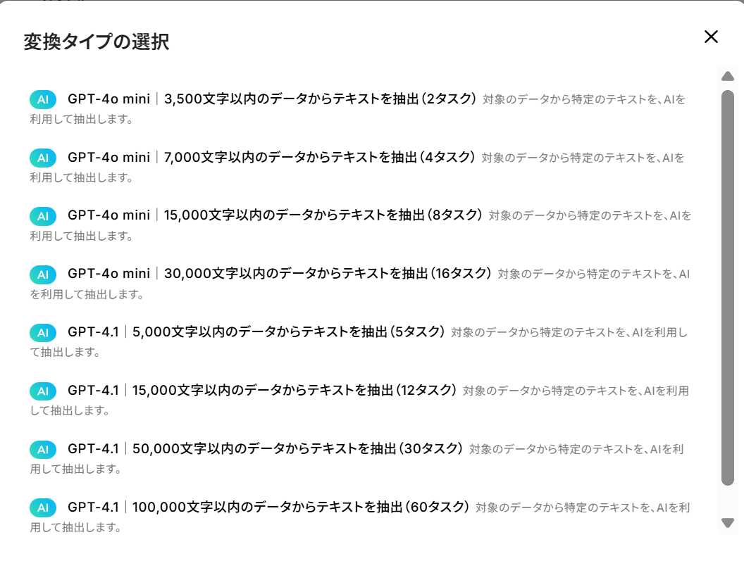 変換タイプ:使用するAIや文字数によって消費するタスク が異なりますので、適切なアクションを選択してください。