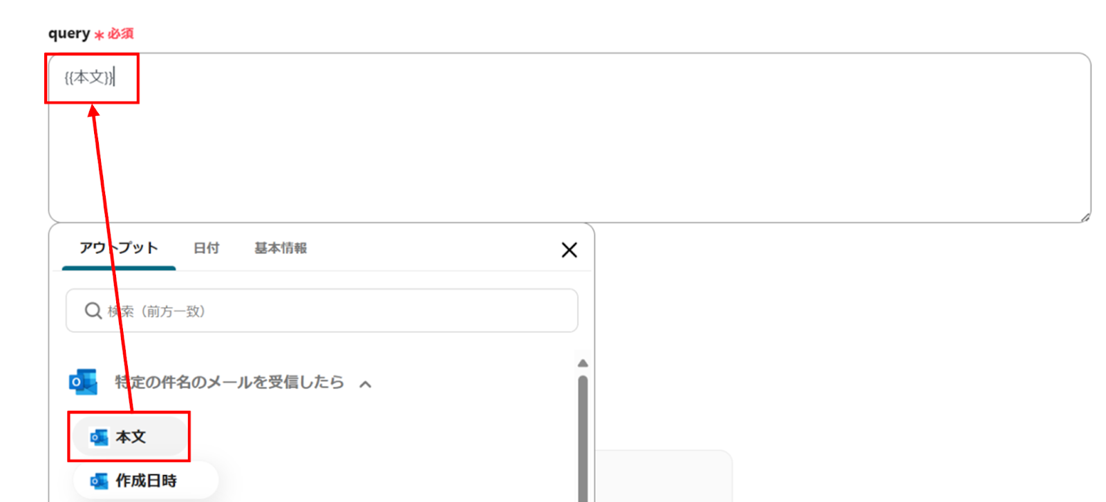 (3)「API接続設定」画面から、queryをアウトプットから選択します。アウトプットから選択することでOutlookの情報を引用できます。
