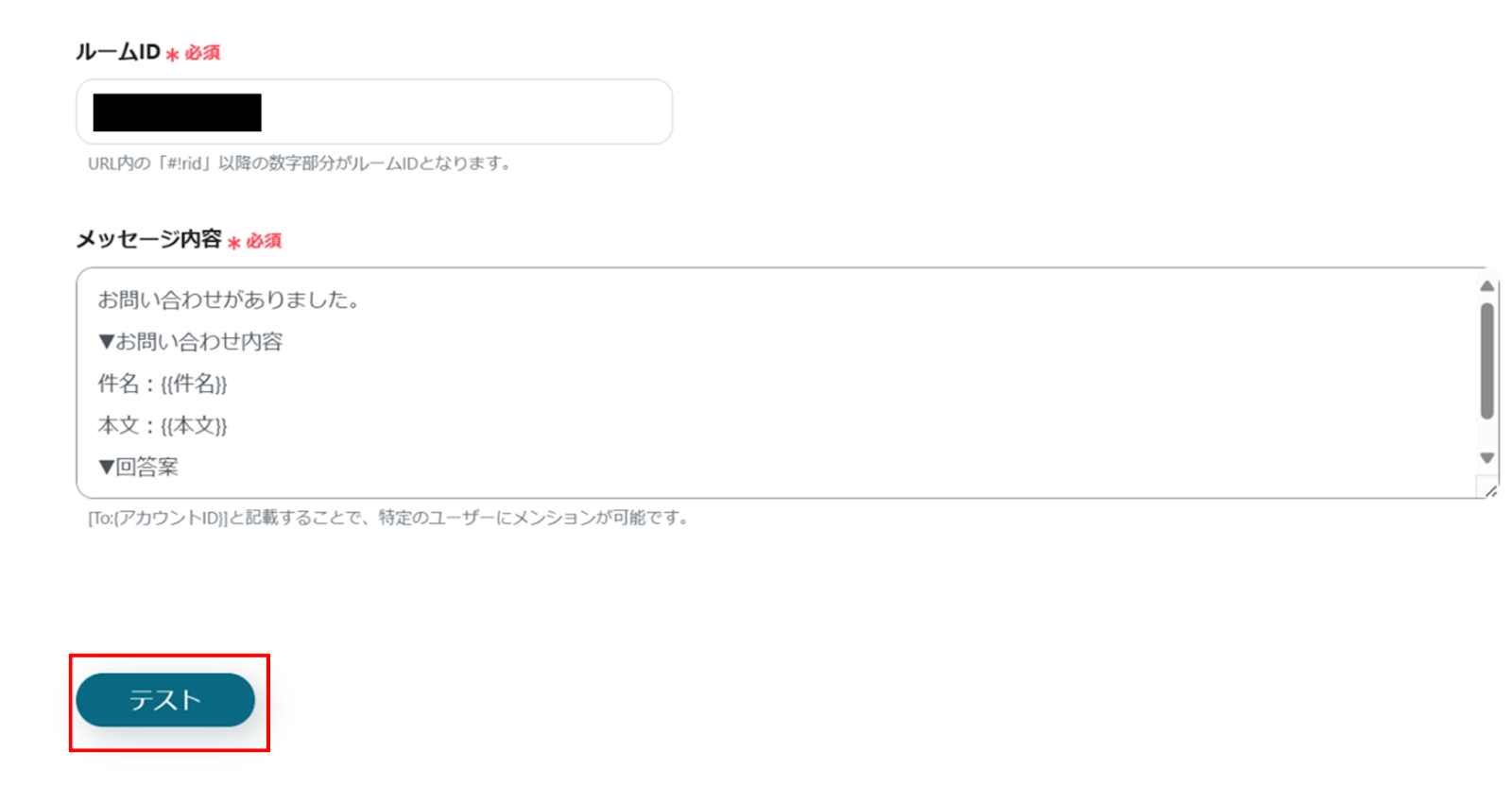 入力が完了したら、「テスト」をクリックし、エラーが発生しなければ、下部にある「保存する」をクリックします。